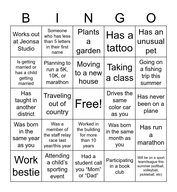 This bingo card has a free space and 45 words: Has a summer birthday, Will be on a sport team/league this summer (softball, volleyball, pickleball, etc), Switching grades next year, Work bestie, Adopting a pet, Participating in a book club, Plants a garden, Has tickets to a music concert this summer, Has an unusual pet, Attending a child’s sporting event, Has a tattoo, Drives the same color car as you, Worked in the building for more than 10 years, Was a member of the staff relay race last year/this year, Has a summer job, Had a student call you “Mom” or “Dad”, Has a commute 30 minutes or more, Has taught in another district, Has had a student fall asleep in class, Going on a fishing trip this summer, Someone who has less than 5 letters in their first name, Attending a Brewer’s game, Attending a Twin’s game, Works out at Jeonsa Studio, Have been fishing in Canada, Has never been on a plane, Is the middle child, Has lived in another country, Was born in the same month as you, Was born in the same year as you, Is a vegetarian, Has run a marathon, Has broken a bone, Has been skiing in the Colorado, Have been to the State Fair, Traveling out of country, Retiring at the end of the year, Going on a camping trip this summer, Moving classrooms, Moving to a new house, Is getting married or has a child getting married, Taking a class, Teaching summer school, Planning to run a 5K, 10K, or marathon and Will visit a national park.