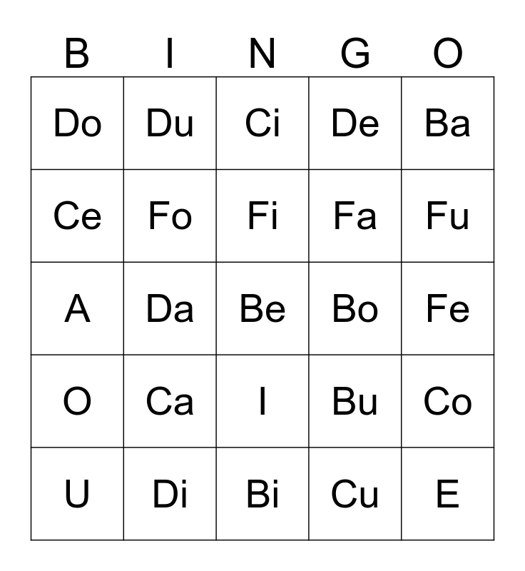 This bingo card has 25 words: Ca, Bi, Fi, U, Ba, Do, Ce, Du, Bo, I, Fa, A, Bu, Co, Fo, E, Fe, Ci, Fu, Da, Be, Di, O, De and Cu.