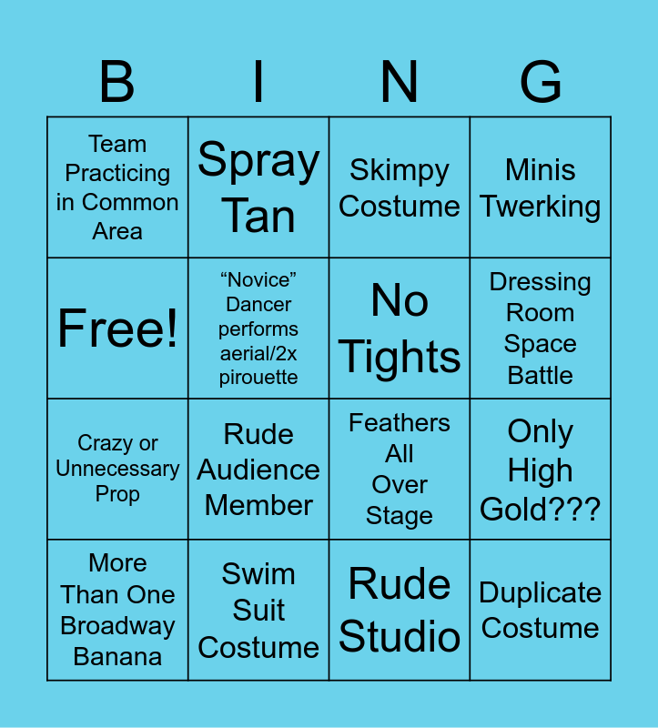 This bingo card has 16 words: Swim Suit Costume, Only High Gold???, Skimpy Costume, Team Practicing in Common Area, Crazy or Unnecessary Prop, Spray Tan, Feathers All Over Stage, Rude Studio, Free!, “Novice” Dancer performs aerial/2x pirouette, More Than One Broadway Banana, Minis Twerking, Rude Audience Member, Dressing Room Space Battle, No Tights and Duplicate Costume.