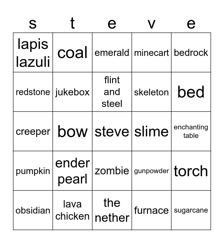This bingo card has a free space and 24 words: ender pearl, lava chicken, flint and steel, obsidian, bedrock, lapis lazuli, redstone, coal, slime, zombie, skeleton, creeper, gunpowder, torch, jukebox, furnace, enchanting table, emerald, bed, bow, sugarcane, pumpkin, minecart and the nether.