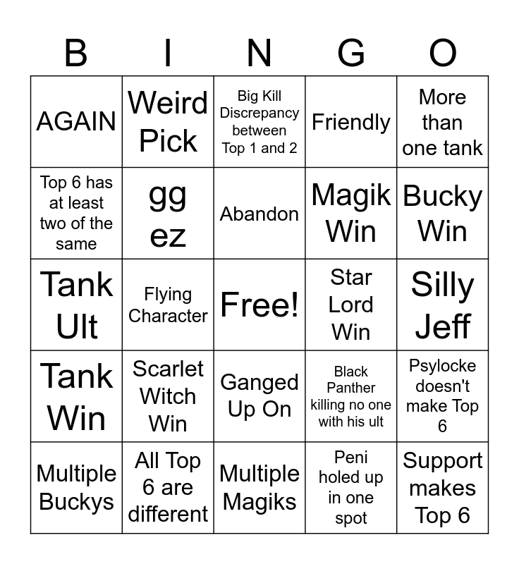 This bingo card has a free space and 29 words: Multiple Buckys, Girl Power, Flying Character, Multiple Ults, AGAIN, Big Kill Discrepancy between Top 1 and 2, gg ez, Scarlet Witch Win, Star Lord Win, All Top 6 are different, Silly Jeff, Support makes Top 6, Multiple Magiks, Peni holed up in one spot, Bucky Win, Spider-Men, Ganged Up On, Tank Win, More than one tank, Tank Ult, Black Panther killing no one with his ult, DPS Jeff, Magik Win, Top 6 has at least two of the same, Friendly, Weird Pick, Psylocke doesn't make Top 6, Abandon and Support Win.