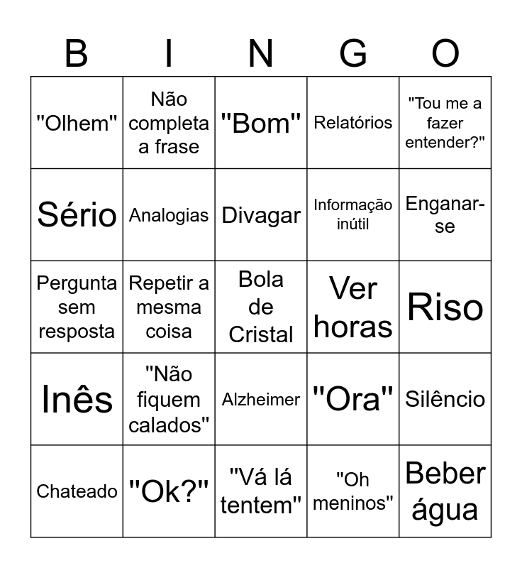 This bingo card has a free space and 26 words: Alzheimer, ''Oh meninos'', Divagar, ''Ok?'', ''Tou me a fazer entender?'', ''Olhem'', Sério, Não completa a frase, Riso, ''Ora'', Informação inútil, Pergunta sem resposta, Silêncio, Chateado, Repetir a mesma coisa, Explocação ''simples'', Relatórios, Inês, ''Bom'', Beber água, Enganar-se, ''Vá lá tentem'', Ver horas, ''Não fiquem calados'', Analogias and ''Por exemplo''.