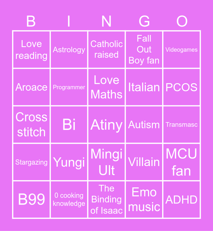 This bingo card has a free space and 24 words: Yungi, 0 cooking knowledge, Love Maths, B99, Videogames, Love reading, Aroace, Astrology, Autism, Mingi Ult, Italian, Cross stitch, Villain, MCU fan, Programmer, Emo music, Transmasc, Catholic raised, PCOS, Bi, ADHD, Stargazing, Fall Out Boy fan and The Binding of Isaac.