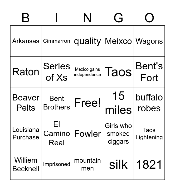 This bingo card has a free space and 24 words: El Camino Real, Imprisoned, Mexico gains independence, Williem Becknell, Wagons, Arkansas, Raton, Cimmarron, 15 miles, Fowler, Taos, Beaver Pelts, Girls who smoked ciggars, Taos Lightening, Series of Xs, silk, buffalo robes, quality, Bent's Fort, Bent Brothers, 1821, Louisiana Purchase, Meixco and mountain men.