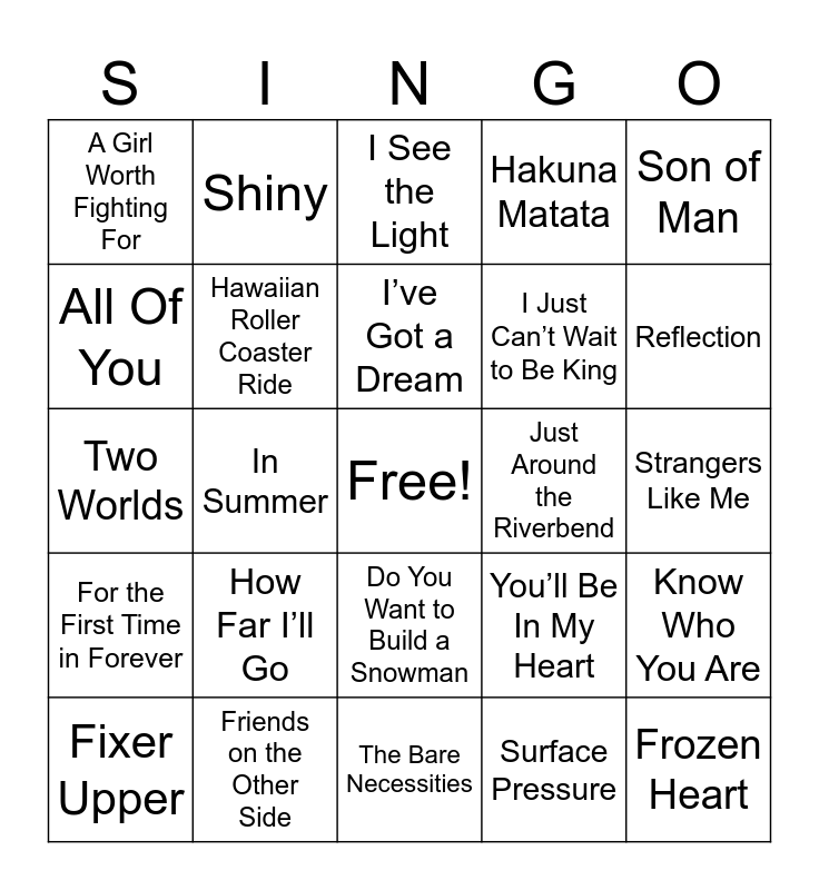 This bingo card has a free space and 72 words: Prince Ali, Shiny, In Summer, Be Our Guest, Gaston, Can You Feel the Love Tonight, Hakuna Matata, Be Prepared, I Just Can’t Wait to Be King, Circle of Life, Fixer Upper, Touch The Sky, Reflection, A Girl Worth Fighting For, That’s How you Know, Two Worlds, You’ll Be In My Heart, Son of Man, Trashin The Camp, Strangers Like Me, How Far I’ll Go, Frozen Heart, Know Who You Are, Reindeers Are Better Than People, One Last Hope, Un Poco Loco, Evermore, Zero To Hero, A Star is Born, Into the Unknown, Friends on the Other Side, Ma Belle Evangeline, Down in New Orleans, We Don’t Talk About Bruno, Surface Pressure, The Family Madrigal, Waiting On A Miracle, What Else Can I Do, All Of You, Shine Your Light, Do You Want to Build a Snowman, Love is an Open Door, One Jump Ahead, A Whole New World, Belle, For the First Time in Forever, Arabian Nights, We Know The Way, You’re Welcome, I’ll Make a Man Out of You, A Dream is a Wish Your Heart Makes, Go the Distance, Colors of the Wind, Just Around the Riverbend, Under the Sea, Part of Your World, I See the Light, I’ve Got a Dream, Mother Knows Best, When Will My Life Begin, Beauty and the Beast, God Help the Outcasts, Mine, Mine, Mine, The Bare Necessities, You’ve Got a Friend in Me, On My Way, Hawaiian Roller Coaster Ride, Honor To Us All, Something There, I Won’t Say, I Wanna Be Like You and Steady as the Beating Drum.