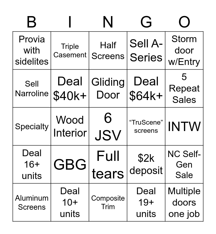 This bingo card has a free space and 59 words: Deal 7+ units, Deal 10+ units, Deal 13+ units, Deal 16+ units, Deal 19+ units, Deal $28k+, Deal $40k+, Deal $52k+, Deal $64k+, Deal $76k+, Sell A-Series, Sell Frenchwood, Sell Narroline, PD with Blinds, Provia Door, Provia with sidelites, Multiple doors one job, Storm door w/Entry, French Door, Gliding Door, “TruScene” screens, Half Screens, Aluminum Screens, NC Self-Gen Sale, 1 Repeat Sale, 2 Repeat Sales, 3 Repeat Sales, 4 Repeat Sales, 5 Repeat Sales, (8) 10’s Medallia this month, Awning, Glider, Triple glider, Double Casement, Triple Casement, Colored window, Dual Colored Window, Wood Interior, Projection Window, Specialty, Window w/Tempered, GBG, INTW, FDL, Sell a window with Smart Glass with Sunshield, Obscure glass, Create an Opening, Lower/Build Down, Full tears, Composite Trim, Prox Deal, Events Deal, 2 deals in 1 day, Esler Financing used, $1k deposit, $2k deposit, $3k deposit, $4k deposit and $5k deposit.