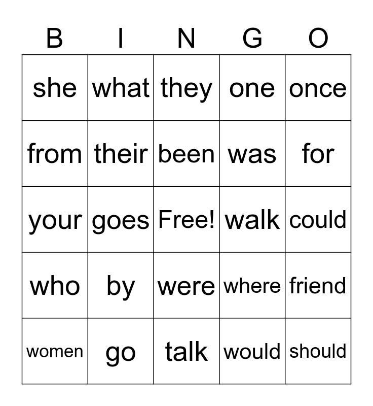 This bingo card has a free space and 30 words: go, no, goes, says, she, they, their, were, walk, talk, could, should, would, or, for, there, where, who, by, once, your, have, what, was, from, one, friend, women, been and any.