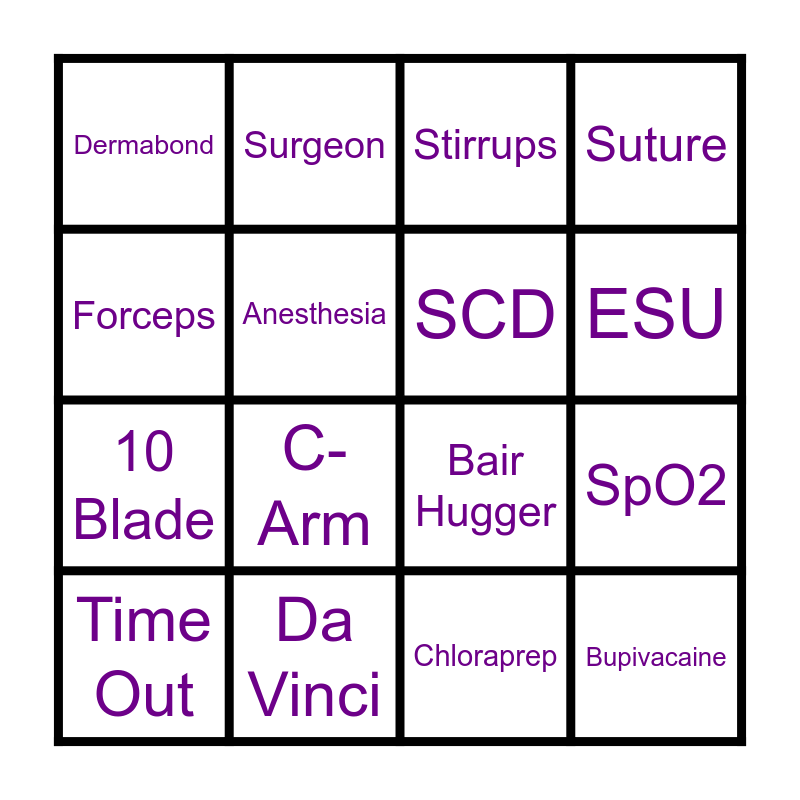 This bingo card has 16 words: Da Vinci, SpO2, Stirrups, Dermabond, 10 Blade, Surgeon, Bair Hugger, Chloraprep, Forceps, Anesthesia, Time Out, Suture, C-Arm, ESU, SCD and Bupivacaine.