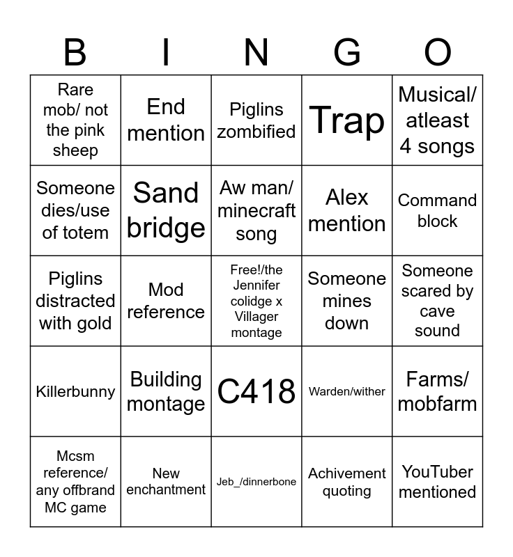 This bingo card has a free space and 49 words: Herobrine, YouTuber mentioned, Notch mention, Jeb_/dinnerbone, Building montage, Sleeping in nether/end, End mention, Cliffhanger, Someone dies/use of totem, New monster, Sand bridge, Trap, Farms/ mobfarm, Warden/wither, Other game mention, Nacho man mention, Aw man/ minecraft song, Someone mines down, Entity 303/ any minecraft creepypasta, Musical/ atleast 4 songs, Mod reference, Achivement quoting, Rare mob/ not the pink sheep, Alex mention, Cornball/ any goofy joke, Command block, Mcsm reference/ any offbrand MC game, Outdated song starts playing, C418, Killerbunny, Single with denarious D, Adult joke, Fandom thing, Creative mode, New enchantment, Someone questions the stacks of 16, Someone questions why you get 3 doors when crafted, Last minute safe, Someone scared by cave sound, Someone attacks enderman with bow, Movie quote, Someone annoyed at wandering trader trades, Respawning, Village raided, Piglins distracted with gold, Piglins zombified, Minecraft minigame mention, LGBTQ and Jack black sings at the end.