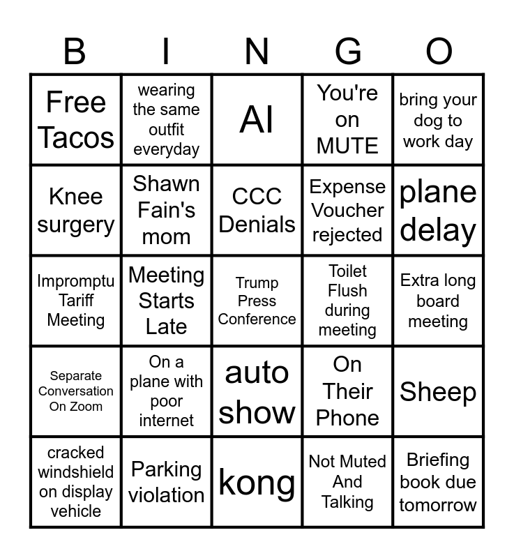 This bingo card has 45 words: Free!, Trump Press Conference, Screen Share Issues, cracked windshield on display vehicle, Baby On Screen, Not Muted And Talking, AI, Gassy on Media Drive, bring your dog to work day, Parking violation, You're on MUTE, Toilet Flush during meeting, auto show, On a plane with poor internet, Lost Iphone, kong, dealer drama, Impromptu Tariff Meeting, AG Board surprise visit, plane delay, wearing the same outfit everyday, media shows up unannounced, UAW sends chocolates, Free Tacos, CEO leaving, Extra long board meeting, Dr. Max Disappearing, Meeting Going Past Time, On Their Phone, Separate Conversation On Zoom, Someone microwaves fish at the office, Sheep, Green Prix, Fluffy, desk reservations, Meeting Starts Late, Forgot badge, Vehicle Display defies BXP rules, Briefing book due tomorrow, CCC Denials, Knee surgery, Expense Voucher rejected, Typing in wrong Teams Chat, Shawn Fain's mom and Stuck on Tarmac for hours.