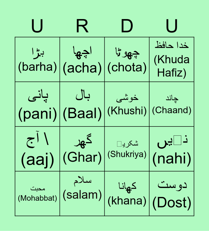 This bingo card has 16 words: سلام (salam), نہیں (nahi), چھوٹا (chota), بڑا (barha), آج \(aaj), اچھا (acha), شکریہ (Shukriya), کھانا (khana), پانی (pani), بال (Baal), محبت (Mohabbat), خدا حافظ (Khuda Hafiz), گھر (Ghar), چاند (Chaand), خوشی (Khushi) and دوست (Dost).