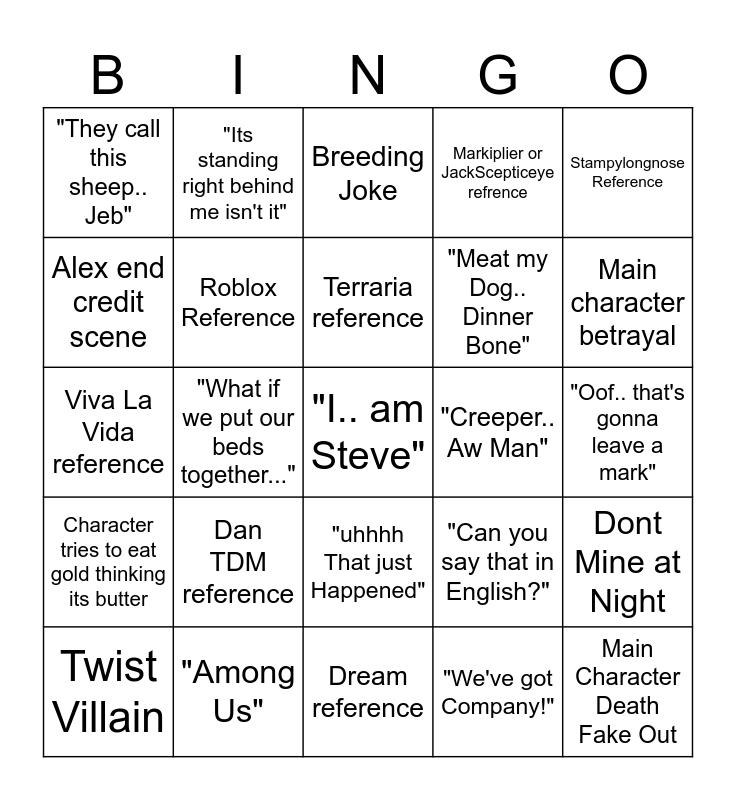 This bingo card has a free space and 24 words: Dan TDM reference, "Among Us", Terraria reference, Twist Villain, Stampylongnose Reference, "They call this sheep.. Jeb", Alex end credit scene, "Its standing right behind me isn't it", "Creeper.. Aw Man", "uhhhh That just Happened", "Meat my Dog.. Dinner Bone", Viva La Vida reference, "Can you say that in English?", Dont Mine at Night, Roblox Reference, "We've got Company!", "Oof.. that's gonna leave a mark", Breeding Joke, Main character betrayal, "What if we put our beds together...", Main Character Death Fake Out, Character tries to eat gold thinking its butter, Markiplier or JackScepticeye refrence and Dream reference.