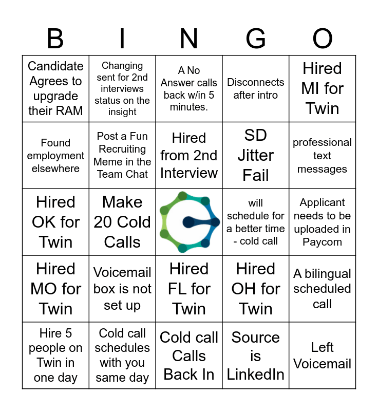 This bingo card has a free space and 29 words: Hire 5 people on Twin in one day, Candidate Types 43+ WPM, Make 20 Cold Calls, 32 GBs RAM on SD, Candidate Agrees to upgrade their RAM, A No Answer calls back w/in 5 minutes., Post a Fun Recruiting Meme in the Team Chat, Voicemail box is not set up, will schedule for a better time - cold call, Cold call schedules with you same day, Applicant needs to be uploaded in Paycom, Left Voicemail, Cold call Calls Back In, Source is LinkedIn, professional text messages, Hired WI for Twin, Hired FL for Twin, Hired MO for Twin, Hired MI for Twin, Hired OK for Twin, Hired OH for Twin, Hired KY for Twin, SD Jitter Fail, Found employment elsewhere, Disconnects after intro, Changing sent for 2nd interviews status on the insight, A bilingual scheduled call, Hired from 2nd Interview and Candidate says the pay is too low.