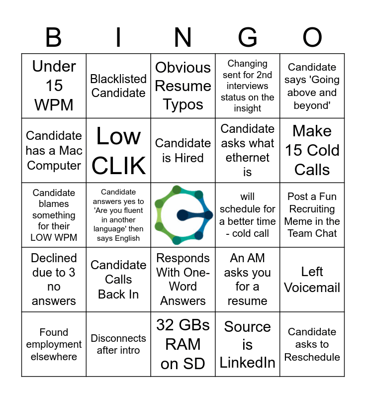This bingo card has a free space and 42 words: Candidate No Answer, Candidate is Hired, Candidate Types 43+ WPM, Candidate Calls Back In, Source is LinkedIn, Left Voicemail, Candidate asks to Reschedule, Candidate Has a Slow or Unstable Internet Connection, Obvious Resume Typos, Responds With One-Word Answers, Post a Fun Recruiting Meme in the Team Chat, Make 15 Cold Calls, Candidate answers yes to 'Are you fluent in another language' then says English, Candidate says 'Going above and beyond', A No Answer calls back w/in 5 minutes., An AM asks you for a resume, Active Agent is on your schedule, Candidate blames something for their LOW WPM, You send to 2nd, Blacklisted Candidate, Candidate has a Mac Computer, Voicemail box is not set up, SD failed due to location, Under 15 WPM, Candidate says: 'I was told you offer EQ', Candidate says the pay is too low, Candidate asks what ethernet is, Candidate is already on the CBL, SD Jitter Fail, Hired from 2nd Interview, Applicant needs to be uploaded in Paycom, Declined due to 3 no answers, Low CLIK, 32 GBs RAM on SD, 3 declines to offers on CBL, Found employment elsewhere, Disconnects after intro, will schedule for a better time - cold call, candidate who isn't fluent in English and cannot understand you, professional text messages, Changing sent for 2nd interviews status on the insight and A bilingual scheduled call.