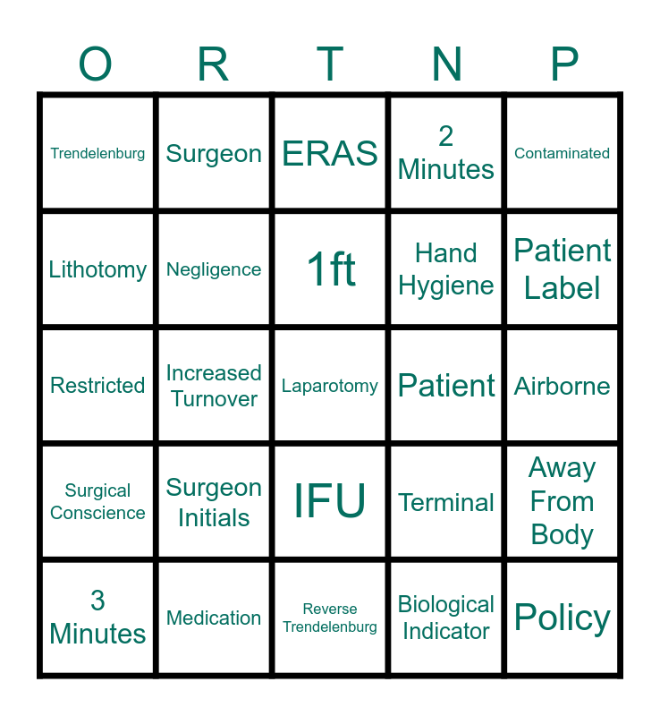 This bingo card has 25 words: Surgeon Initials, Reverse Trendelenburg, 1ft, 3 Minutes, Contaminated, Trendelenburg, Lithotomy, Surgeon, Patient, IFU, Hand Hygiene, Restricted, Terminal, Away From Body, Negligence, Policy, Airborne, ERAS, Patient Label, Increased Turnover, Laparotomy, Medication, Surgical Conscience, 2 Minutes and Biological Indicator.