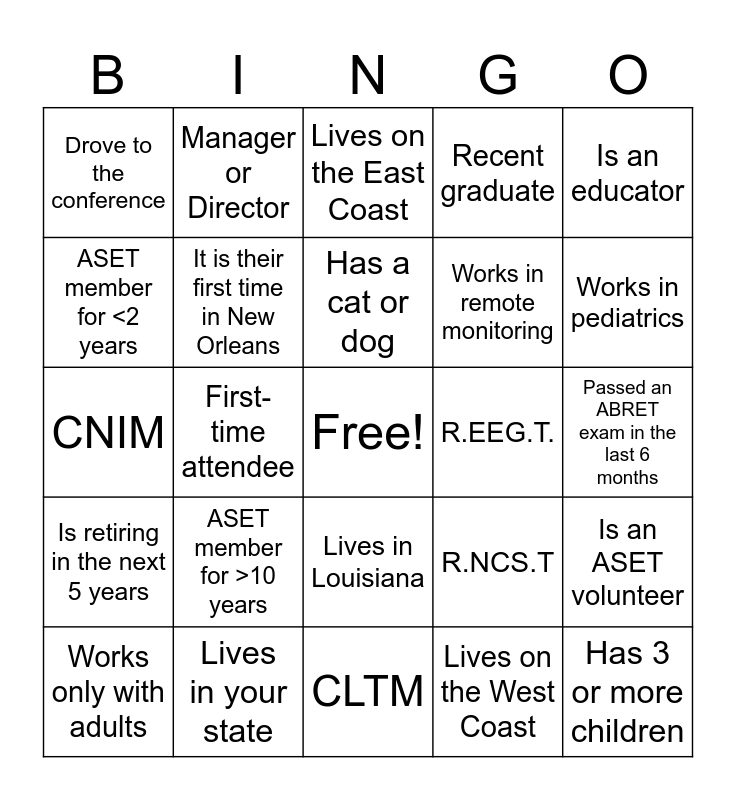 This bingo card has a free space and 24 words: ASET member for >10 years, Lives in your state, Has a cat or dog, Works only with adults, Is an educator, Drove to the conference, ASET member for <2 years, Manager or Director, R.EEG.T., Lives in Louisiana, Works in remote monitoring, CNIM, R.NCS.T, Is an ASET volunteer, It is their first time in New Orleans, Lives on the West Coast, Passed an ABRET exam in the last 6 months, Lives on the East Coast, Works in pediatrics, First-time attendee, Has 3 or more children, Is retiring in the next 5 years, Recent graduate and CLTM.