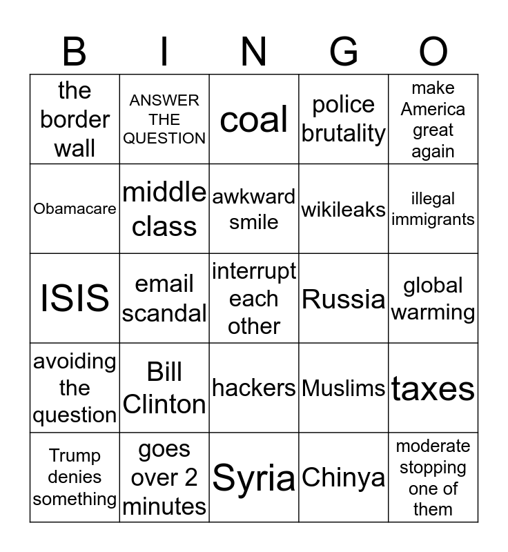 This bingo card has a free space and 24 words: Bill Clinton, goes over 2 minutes, awkward smile, Trump denies something, make America great again, the border wall, Obamacare, ANSWER THE QUESTION, Russia, hackers, wikileaks, ISIS, Muslims, taxes, middle class, Chinya, global warming, coal, illegal immigrants, email scandal, moderate stopping one of them, avoiding the question, police brutality and Syria.