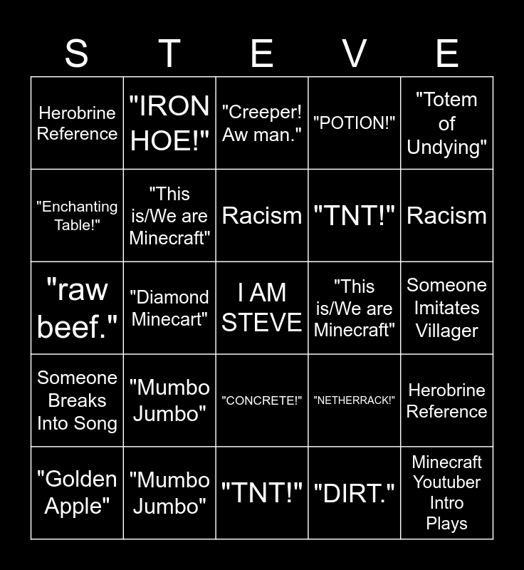 This bingo card has a free space and 38 words: "Don't mine straight down", "Creeper! Aw man.", "DIAMONDS!", "This is/We are Minecraft", Herobrine Reference, "Mumbo Jumbo", Racism, "Golden Apple", "Totem of Undying", "TNT!", "Diamond Minecart", "POTION!", Minecraft Youtuber Intro Plays, Someone Imitates Villager, "Enchanting Table!", Someone Breaks Into Song, "Don't mine straight down", "Creeper! Aw man.", "DIAMONDS!", "This is/We are Minecraft", Herobrine Reference, "Mumbo Jumbo", Racism, "Golden Apple", "Totem of Undying", "TNT!", "Diamond Minecart", "POTION!", Minecraft Youtuber Intro Plays, Someone Imitates Villager, "Enchanting Table!", "CONCRETE!", "DIRT.", "IRON HOE!", "CAKE.", "NETHERRACK!", "raw beef." and "BOW AND ARROW.".