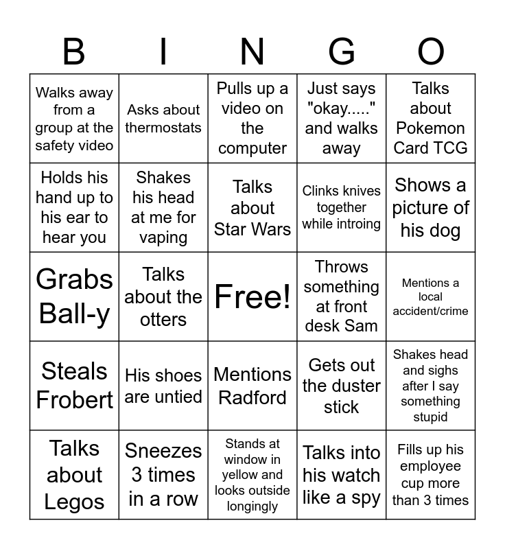 This bingo card has a free space and 24 words: His shoes are untied, Sneezes 3 times in a row, Talks about Star Wars, Talks about Legos, Talks about Pokemon Card TCG, Walks away from a group at the safety video, Holds his hand up to his ear to hear you, Asks about thermostats, Throws something at front desk Sam, Mentions Radford, Clinks knives together while introing, Grabs Ball-y, Gets out the duster stick, Shakes head and sighs after I say something stupid, Shakes his head at me for vaping, Talks into his watch like a spy, Mentions a local accident/crime, Pulls up a video on the computer, Shows a picture of his dog, Talks about the otters, Fills up his employee cup more than 3 times, Steals Frobert, Just says "okay....." and walks away and Stands at window in yellow and looks outside longingly.