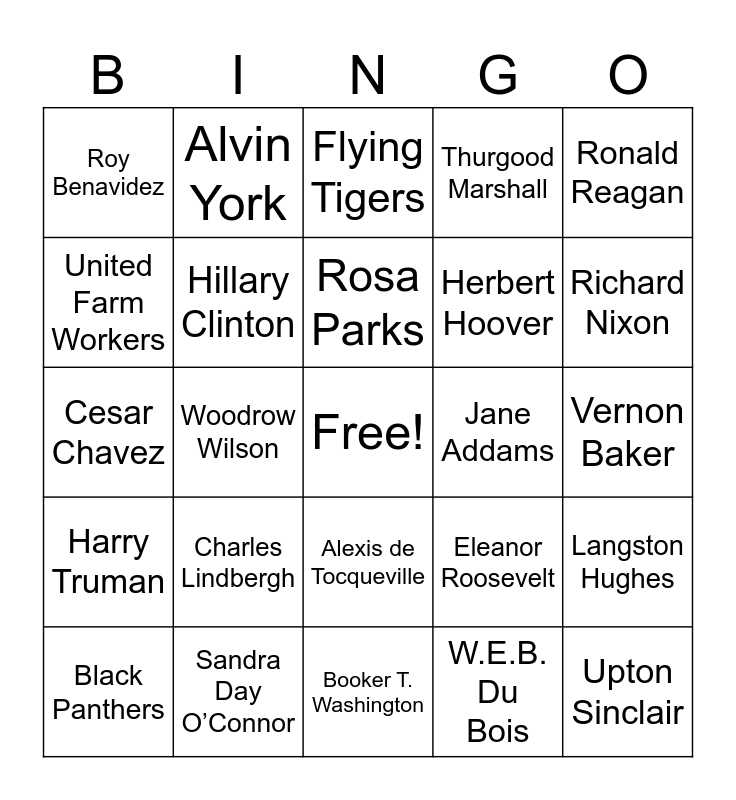 This bingo card has a free space and 51 words: Sanford B. Dole, Upton Sinclair, Henry Ford, Booker T. Washington, Charles Lindbergh, Bill Clinton, Alvin York, Marcus Garvey, United Farm Workers, Andrew Carnegie, Hillary Clinton, Thurgood Marshall, Langston Hughes, Eleanor Roosevelt, Warren G. Harding, Douglas MacArthur, Rosa Parks, Jane Addams, Betty Friedan, Ronald Reagan, Woodrow Wilson, W.E.B. Du Bois, Roy Benavidez, Herbert Hoover, American Expeditionary Forces, Ida B. Wells, Richard Nixon, F. Scott Fitzgerald, Black Panthers, Flying Tigers, Dwight Eisenhower, Little Rock Nine, Clarence Darrow, William Jennings Bryan, Franklin Roosevelt, Sandra Day O’Connor, Chester Nimitz, John J. Pershing, Susan B. Anthony, Sonia Sotomayor, Vernon Baker, Harry Truman, Joseph McCarthy, Alfred T. Mahan, Dolores Huerta, Tuskegee Airmen, Cesar Chavez, John F. Kennedy, Martin Luther King, Jr., Alexis de Tocqueville and Billy Graham.
