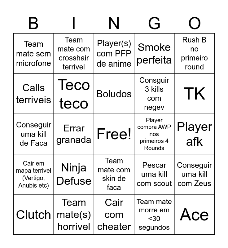 This bingo card has a free space and 24 words: Clutch, Ninja Defuse, Boludos, Team mate morre em <30 segundos, Rush B no primeiro round, Team mate sem microfone, Team mate com crosshair terrivel, Player(s) com PFP de anime, Player compra AWP nos primeiros 4 Rounds, Player afk, Conseguir uma kill de Faca, Teco teco, Pescar uma kill com scout, Conseguir uma kill com Zeus, Calls terriveis, Team mate(s) horrivel, Cair com cheater, Smoke perfeita, TK, Cair em mapa terrivel (Vertigo, Anubis etc), Errar granada, Team mate com skin de faca, Consguir 3 kills com negev and Ace.