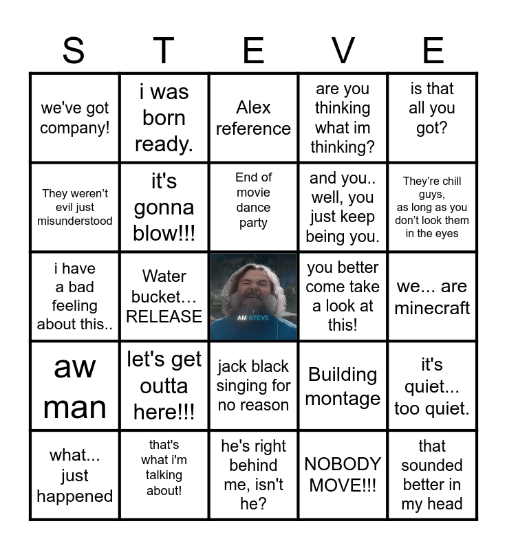 This bingo card has a free space and 24 words: let's get outta here!!!, that's what i'm talking about!, End of movie dance party, what... just happened, is that all you got?, we've got company!, They weren’t evil just misunderstood, i was born ready., you better come take a look at this!, jack black singing for no reason, and you.. well, you just keep being you., i have a bad feeling about this.., Building montage, it's quiet... too quiet., it's gonna blow!!!, NOBODY MOVE!!!, we... are minecraft, Alex reference, They’re chill guys, as long as you don’t look them in the eyes, Water bucket… RELEASE, that sounded better in my head, aw man, are you thinking what im thinking? and he's right behind me, isn't he?.