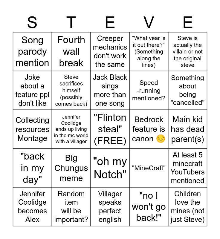 This bingo card has a free space and 24 words: Big Chungus meme, Random item will be important?, Jack Black sings more than one song, Jennifer Coolidge becomes Alex, Steve is actually the villain or not the original steve, Song parody mention, Joke about a feature ppl don't like, Fourth wall break, Bedrock feature is canon 😔, "oh my Notch", Speed -running mentioned?, Collecting resources Montage, "MineCraft", At least 5 minecraft YouTubers mentioned, Steve sacrifices himself (possibly comes back), "no I won't go back!", Main kid has dead parent(s), Creeper mechanics don't work the same, Something about being "cancelled", Jennifer Coolidge ends up living in the mc world with a villager, Children love the mines (not just Steve), "back in my day", "What year is it out there?" (Something along the lines) and Villager speaks perfect english.