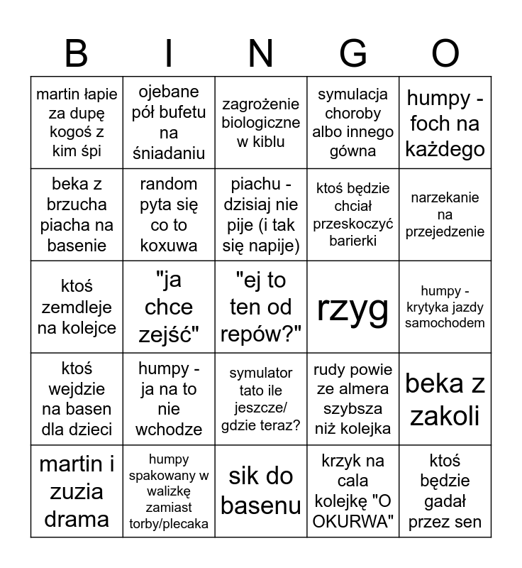 This bingo card has a free space and 24 words: martin i zuzia drama, humpy - ja na to nie wchodze, piachu - dzisiaj nie pije (i tak się napije), krzyk na cala kolejkę "O OKURWA", humpy - foch na każdego, martin łapie za dupę kogoś z kim śpi, ojebane pół bufetu na śniadaniu, zagrożenie biologiczne w kiblu, rzyg, humpy - krytyka jazdy samochodem, ktoś zemdleje na kolejce, random pyta się co to koxuwa, rudy powie ze almera szybsza niż kolejka, beka z zakoli, beka z brzucha piacha na basenie, humpy spakowany w walizkę zamiast torby/plecaka, sik do basenu, symulacja choroby albo innego gówna, narzekanie na przejedzenie, ktoś wejdzie na basen dla dzieci, "ja chce zejść", symulator tato ile jeszcze/ gdzie teraz?, ktoś będzie chciał przeskoczyć barierki and ktoś będzie gadał przez sen.
