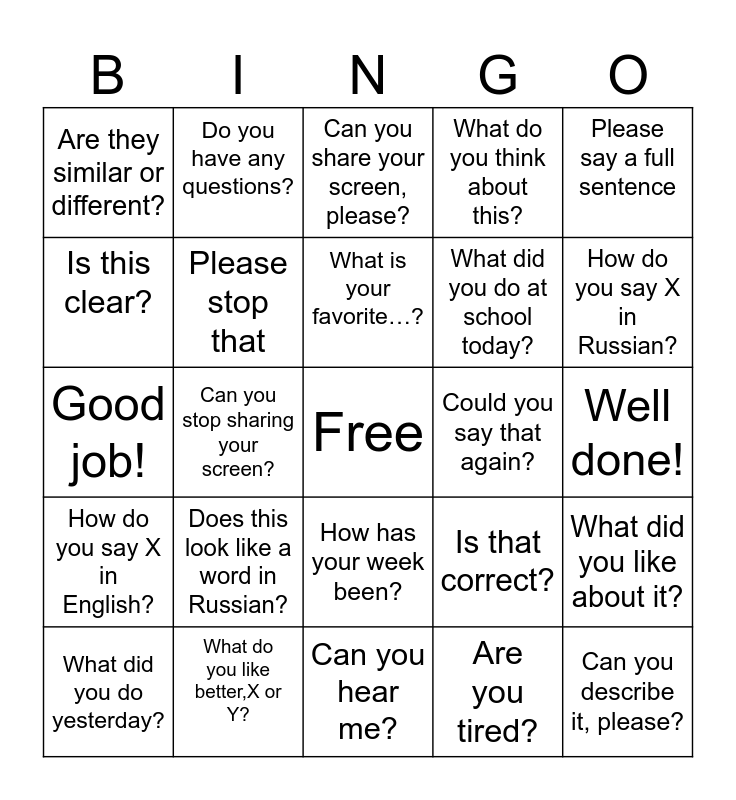 This bingo card has a free space and 24 words: Does this look like a word in Russian?, What do you like better,X or Y?, What is your favorite…?, What did you do yesterday?, Please say a full sentence, Are they similar or different?, Is this clear?, Do you have any questions?, Could you say that again?, How has your week been?, What did you do at school today?, Good job!, Is that correct?, What did you like about it?, Please stop that, Are you tired?, Well done!, Can you share your screen, please?, How do you say X in Russian?, Can you stop sharing your screen?, Can you describe it, please?, How do you say X in English?, What do you think about this? and Can you hear me?.