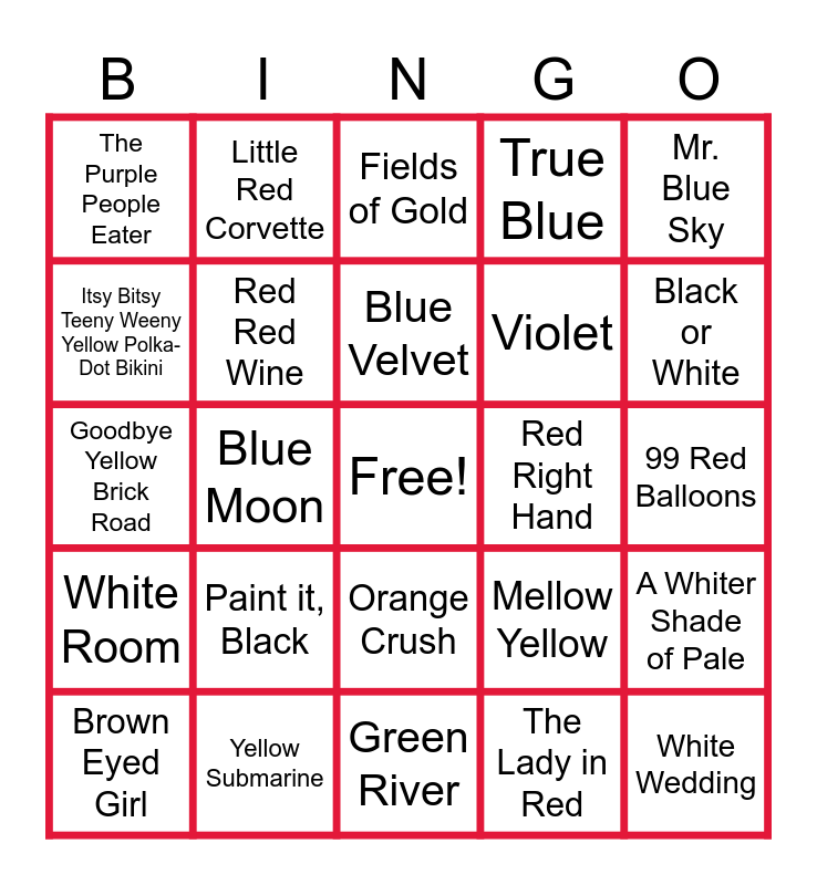 This bingo card has a free space and 24 words: Paint it, Black, Yellow Submarine, Blue Velvet, Brown Eyed Girl, Mr. Blue Sky, The Purple People Eater, Itsy Bitsy Teeny Weeny Yellow Polka-Dot Bikini, Little Red Corvette, Red Right Hand, Orange Crush, Violet, Goodbye Yellow Brick Road, Mellow Yellow, A Whiter Shade of Pale, Red Red Wine, The Lady in Red, 99 Red Balloons, Fields of Gold, Black or White, Blue Moon, White Wedding, White Room, True Blue and Green River.