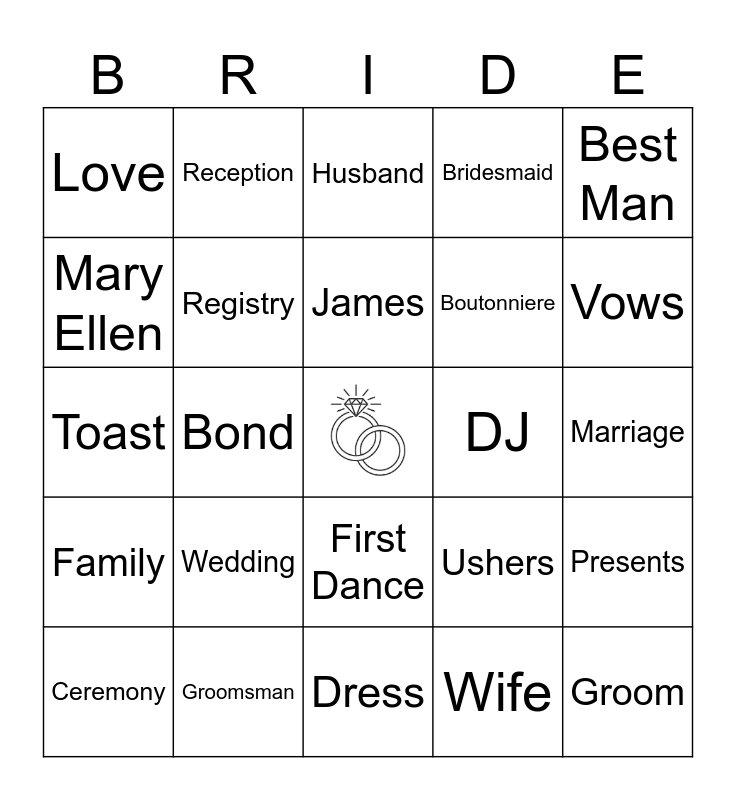 This bingo card has a free space and 44 words: Bride, Groom, Rings, Ceremony, Flowers, Wife, Husband, Maid of Honor, Best Man, Groomsman, Bridesmaid, DJ, First Dance, Wedding, Bouquet, Dress, Suit, Toast, Veil, Vows, Reception, Honeymoon, Bridal Shower, Love, Cake, Marriage, Photographer, Videographer, Ushers, Family, Friends, Presents, Kiss, Invitation, Bond, Aisle, Hotel, Garden, James, Mary Ellen, Boutonniere, Certificate, Registry and In-Laws.