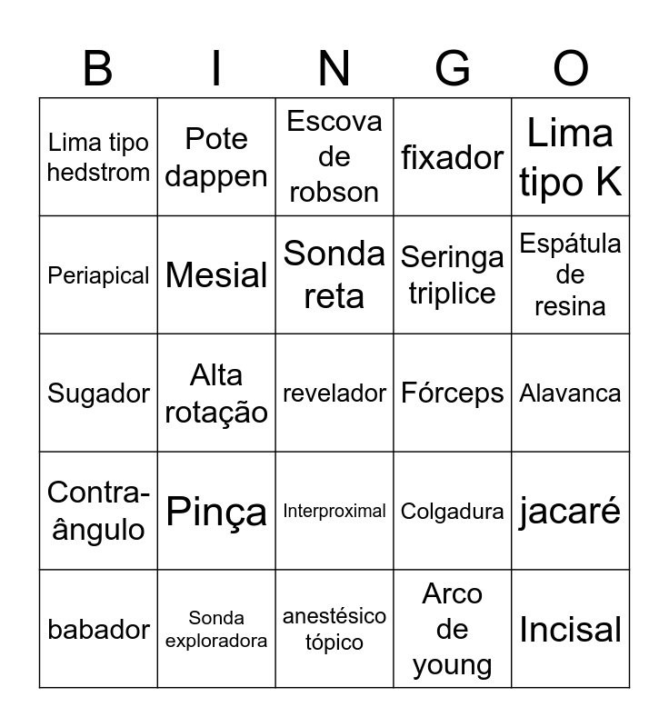 This bingo card has a free space and 24 words: Pinça, Sonda exploradora, Sonda reta, babador, Lima tipo K, Lima tipo hedstrom, Periapical, Pote dappen, Fórceps, Interproximal, Seringa triplice, Sugador, Colgadura, jacaré, Mesial, Arco de young, Alavanca, Escova de robson, Espátula de resina, Alta rotação, Incisal, Contra-ângulo, fixador and anestésico tópico.