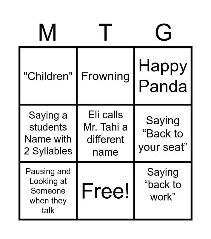 This bingo card has 10 words: Free!, Happy Panda, "Children", Eli calls Mr. Tahi a different name, Saying a students Name with 2 Syllables, Pausing and Looking at Someone when they talk, Frowning, Eating lunch as you walk in the class, Saying “Back to your seat” and Saying “back to work”.