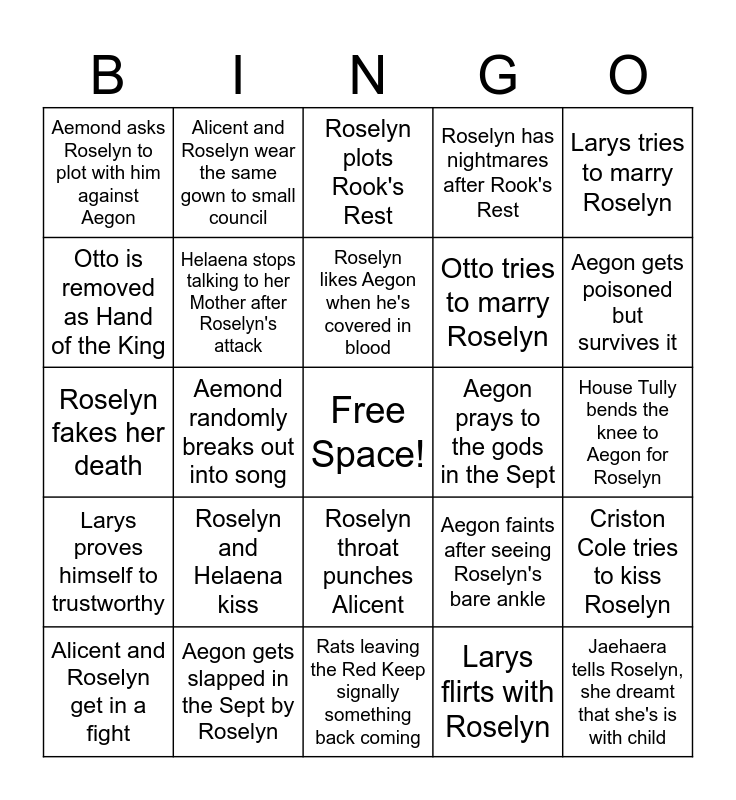 This bingo card has a free space and 24 words: Roselyn and Helaena kiss, Aegon gets slapped in the Sept by Roselyn, Roselyn likes Aegon when he's covered in blood, Alicent and Roselyn get in a fight, Larys tries to marry Roselyn, Aemond asks Roselyn to plot with him against Aegon, Otto is removed as Hand of the King, Alicent and Roselyn wear the same gown to small council, Aegon prays to the gods in the Sept, Roselyn throat punches Alicent, Otto tries to marry Roselyn, Roselyn fakes her death, Aegon faints after seeing Roselyn's bare ankle, Criston Cole tries to kiss Roselyn, Helaena stops talking to her Mother after Roselyn's attack, Larys flirts with Roselyn, House Tully bends the knee to Aegon for Roselyn, Roselyn plots Rook's Rest, Aegon gets poisoned but survives it, Aemond randomly breaks out into song, Jaehaera tells Roselyn, she dreamt that she's is with child, Larys proves himself to trustworthy, Roselyn has nightmares after Rook's Rest and Rats leaving the Red Keep signally something back coming.