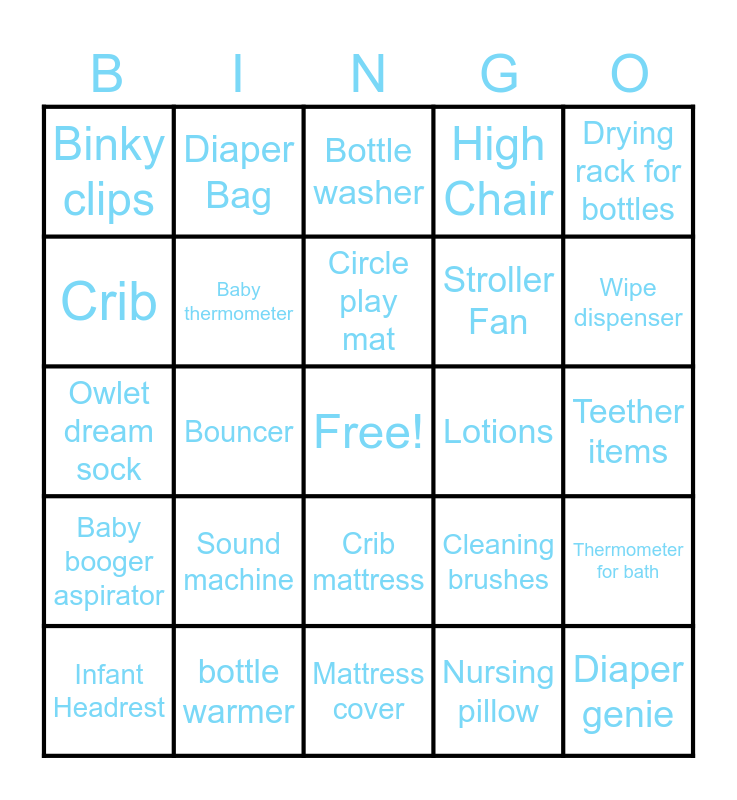 This bingo card has a free space and 45 words: Stroller, Diaper genie, Table Chair, Infant Headrest, Burp cloth, Nursing pillow, Bottle washer, breast pump, Drying rack for bottles, bottle warmer, High Chair, Lotions, Crib mattress, Sound machine, Swaddle, Mattress cover, baby shusher, Owlet dream sock, Bassinet, Wipe dispenser, Diaper Bag, Baby carrier, Hip seat carrier, Binky clips, Blue pacifier, Teether items, Air purifier, Sterilizer, Cleaning brushes, Baby booger aspirator, Stroller organizer, Thermometer for bath, Baby hooded towel, Tub, Hat, Bouncer, Playpen, Changing mat, Pack n play, Circle play mat, Crib, Stroller Fan, 3 tier cart, Baby thermometer and Diaper creams.