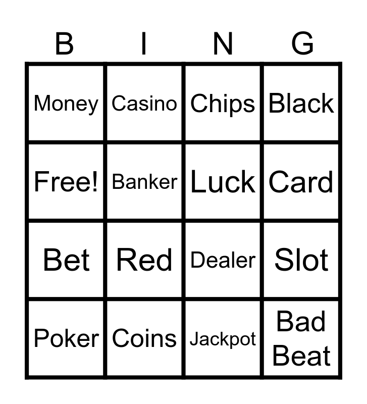 This bingo card has 16 words: Coins, Slot, Chips, Money, Bet, Casino, Dealer, Jackpot, Free!, Banker, Poker, Black, Red, Card, Luck and Bad Beat.