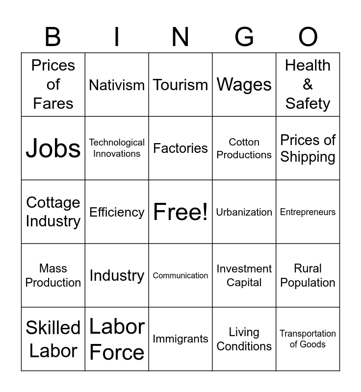 This bingo card has a free space and 24 words: Industry, Labor Force, Factories, Skilled Labor, Health & Safety, Prices of Fares, Jobs, Nativism, Urbanization, Communication, Cotton Productions, Cottage Industry, Investment Capital, Rural Population, Technological Innovations, Living Conditions, Entrepreneurs, Tourism, Prices of Shipping, Efficiency, Transportation of Goods, Mass Production, Wages and Immigrants.