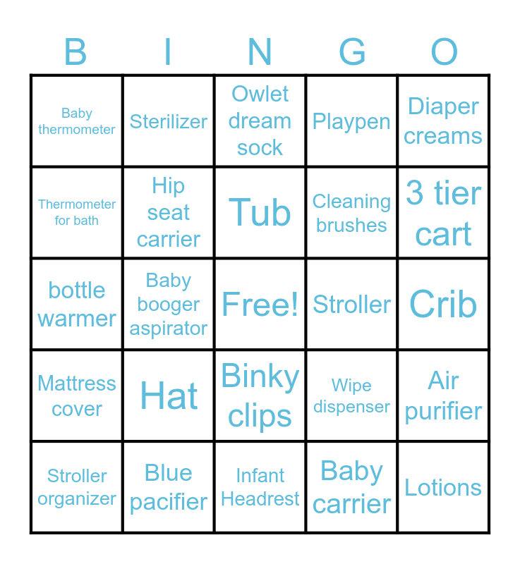 This bingo card has a free space and 45 words: Diaper genie, Lotions, Baby hooded towel, Stroller organizer, baby shusher, Baby carrier, Owlet dream sock, Nursing pillow, Diaper creams, Blue pacifier, Playpen, Stroller, Binky clips, Hat, breast pump, Infant Headrest, Crib mattress, bottle warmer, Table Chair, 3 tier cart, Sterilizer, Drying rack for bottles, Bouncer, Baby thermometer, Bassinet, Crib, High Chair, Pack n play, Wipe dispenser, Mattress cover, Changing mat, Air purifier, Burp cloth, Teether items, Sound machine, Baby booger aspirator, Bottle washer, Diaper Bag, Stroller Fan, Tub, Thermometer for bath, Cleaning brushes, Swaddle, Hip seat carrier and Circle play mat.