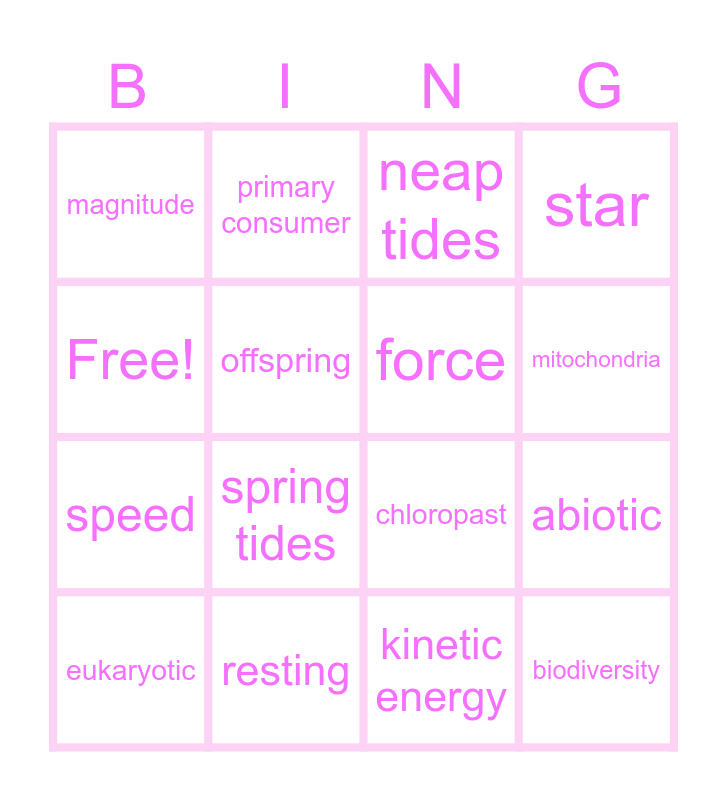 This bingo card has 16 words: resting, abiotic, neap tides, magnitude, speed, primary consumer, chloropast, kinetic energy, Free!, offspring, eukaryotic, star, spring tides, mitochondria, force and biodiversity.