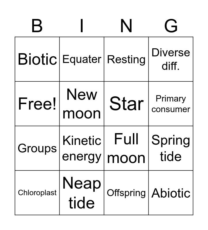 This bingo card has 16 words: Neap tide, Spring tide, Resting, Biotic, Groups, Equater, Full moon, Offspring, Free!, New moon, Chloroplast, Diverse diff., Kinetic energy, Primary consumer, Star and Abiotic.