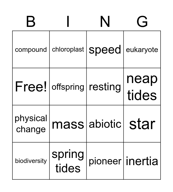 This bingo card has 16 words: spring tides, star, speed, compound, physical change, chloroplast, abiotic, pioneer, Free!, offspring, biodiversity, eukaryote, mass, neap tides, resting and inertia.