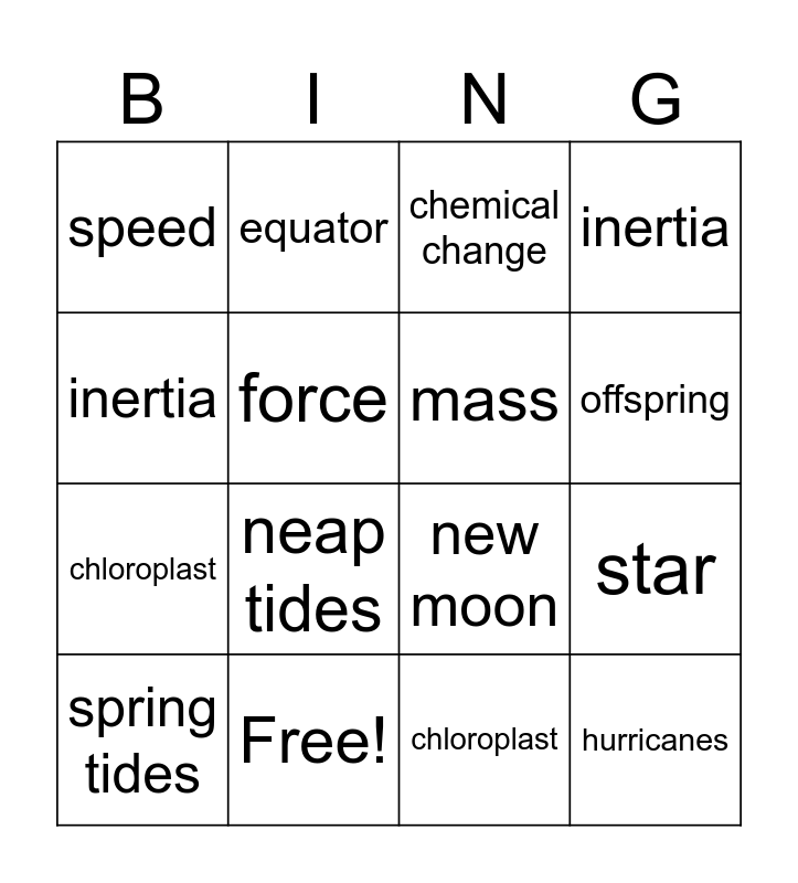 This bingo card has 24 words: kentic energy, mass, offspring, eukaryotic, inertia, speed, force, equator, Free!, resting, chloroplast, new moon, element, mitochondria, mass, physical change, chloroplast, chemical change, neap tides, star, spring tides, hurricanes, inertia and abiotic.