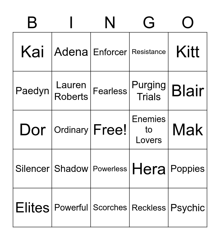 This bingo card has a free space and 26 words: Powerless, Reckless, Fearless, Powerful, Kitt, Kai, Paedyn, Adena, Mak, Hera, Purging Trials, Dor, Poppies, Elites, Ordinary, Ilya, Resistance, Silencer, Enforcer, Psychic, Blair, Scorches, Enemies to Lovers, Shadow, Lauren Roberts and Veil.