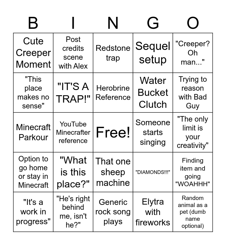 This bingo card has a free space and 24 words: "What is this place?", "He's right behind me, isn't he?", Herobrine Reference, "It's a work in progress", "Creeper? Oh man...", Cute Creeper Moment, "This place makes no sense", Post credits scene with Alex, Someone starts singing, That one sheep machine, Water Bucket Clutch, Minecraft Parkour, "DIAMONDS!!!", Finding item and going "WOAHHH", "IT'S A TRAP!", Elytra with fireworks, "The only limit is your creativity", Redstone trap, Trying to reason with Bad Guy, YouTube Minecrafter reference, Random animal as a pet (dumb name optional), Option to go home or stay in Minecraft, Sequel setup and Generic rock song plays.
