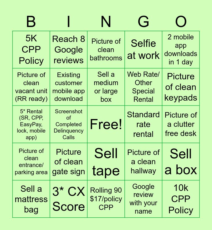 This bingo card has a free space and 24 words: Sell a mattress bag, Picture of clean gate sign, Sell a medium or large box, Google review with your name, 2 mobile app downloads in 1 day, 5K CPP Policy, Reach 8 Google reviews, Picture of clean bathrooms, Standard rate rental, Picture of a clutter free desk, 5* Rental (SR, CPP, EasyPay, lock, mobile app), Existing customer mobile app download, Picture of a clean hallway, Sell a box, Picture of clean vacant unit (RR ready), 3* CX Score, Rolling 90 $17/policy CPP, Selfie at work, Picture of clean keypads, Picture of clean entrance/ parking area, Screenshot of Completed Delinquency Calls, Sell tape, Web Rate/ Other Special Rental and 10k CPP Policy.