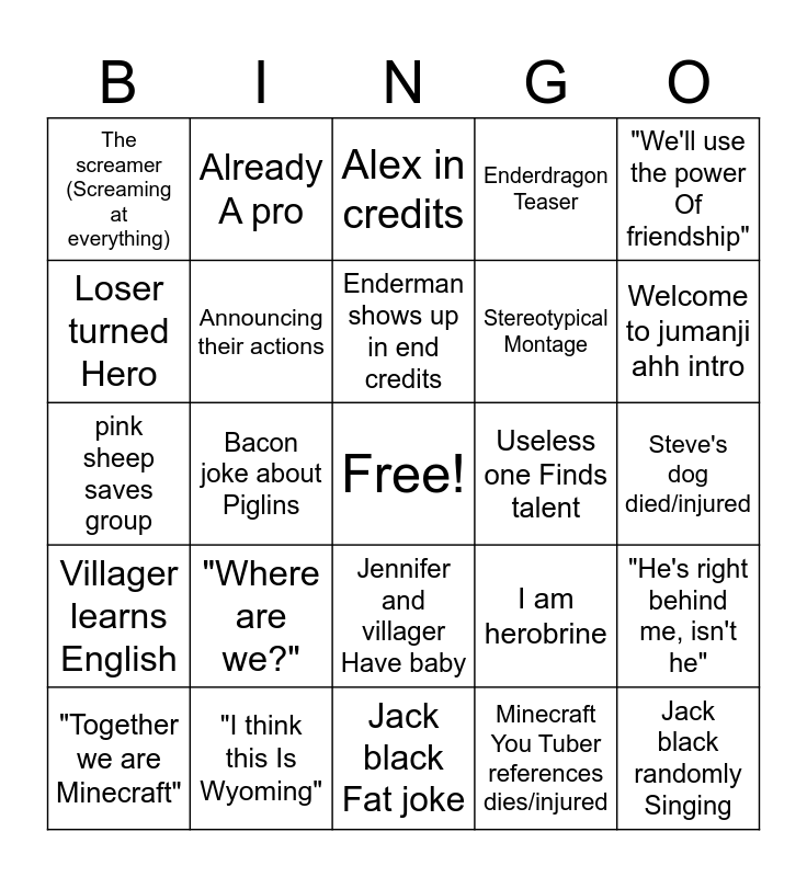 This bingo card has a free space and 24 words: "Where are we?", "I think this Is Wyoming", Enderman shows up in end credits, "Together we are Minecraft", "We'll use the power Of friendship", The screamer (Screaming at everything), Loser turned Hero, Already A pro, Useless one Finds talent, Jennifer and villager Have baby, Stereotypical Montage, pink sheep saves group, I am herobrine, "He's right behind me, isn't he", Announcing their actions, Minecraft You Tuber references dies/injured, Steve's dog died/injured, Alex in credits, Welcome to jumanji ahh intro, Bacon joke about Piglins, Jack black randomly Singing, Villager learns English, Enderdragon Teaser and Jack black Fat joke.