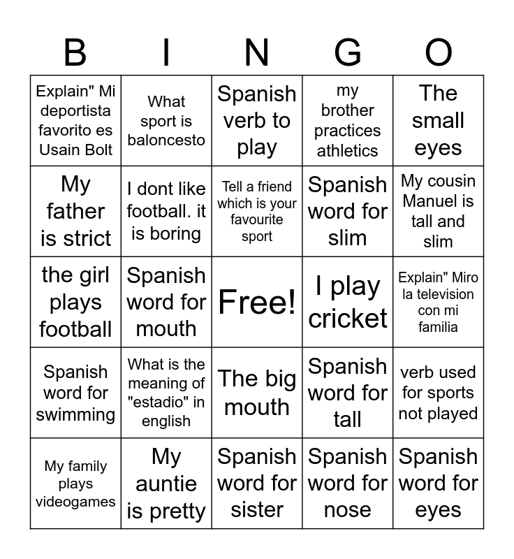 This bingo card has a free space and 27 words: Spanish word for tall, Spanish word for big, Spanish word for slim, Spanish word for sister, My father is strict, Spanish verb to play, What sport is baloncesto, Spanish word for swimming, I play cricket, verb used for sports not played, the girl plays football, my brother practices athletics, My family plays videogames, My auntie is pretty, My cousin Manuel is tall and slim, i like sports, I dont like football. it is boring, Tell a friend which is your favourite sport, What is the meaning of "estadio" in english, Explain" Mi deportista favorito es Usain Bolt, Explain" Miro la television con mi familia, Spanish word for nose, Spanish word for mouth, Spanish word for eyes, The big mouth, The small eyes and The red nose.