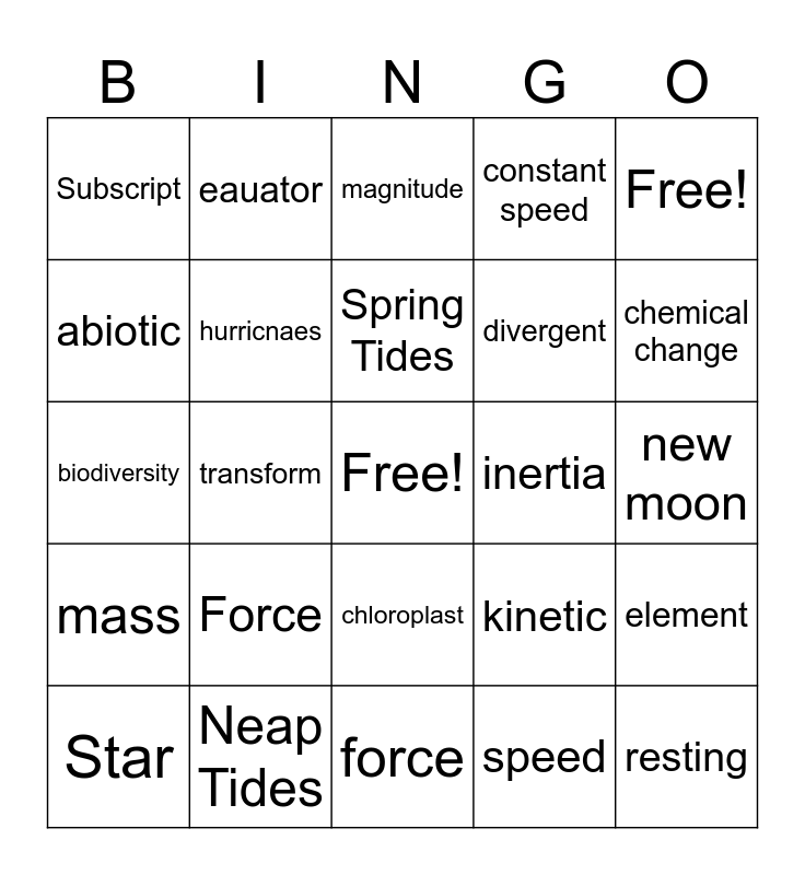 This bingo card has a free space and 24 words: Force, Neap Tides, Spring Tides, Star, Free!, Subscript, abiotic, eauator, inertia, chloroplast, divergent, biodiversity, kinetic, element, hurricnaes, speed, new moon, magnitude, chemical change, transform, resting, mass, constant speed and force.