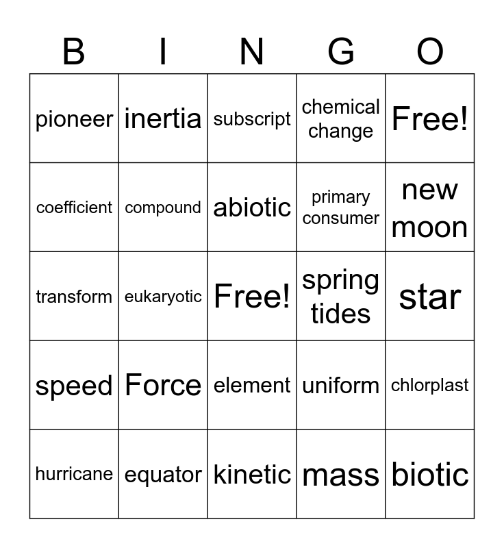 This bingo card has a free space and 24 words: Force, equator, abiotic, hurricane, Free!, pioneer, coefficient, inertia, spring tides, element, primary consumer, transform, uniform, chlorplast, compound, mass, star, subscript, new moon, eukaryotic, biotic, speed, chemical change and kinetic.