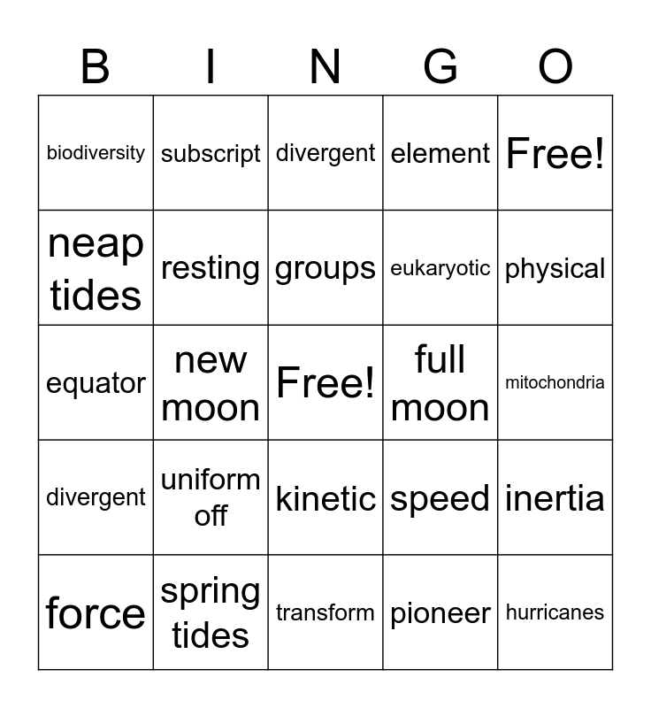 This bingo card has a free space and 24 words: uniform off, spring tides, groups, force, Free!, biodiversity, neap tides, subscript, full moon, kinetic, eukaryotic, equator, speed, inertia, resting, pioneer, mitochondria, divergent, physical, new moon, hurricanes, divergent, element and transform.